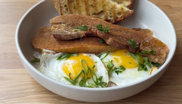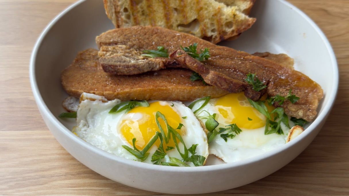Two eggs served with two slices of crispy pork belly and a side of house-made toast.